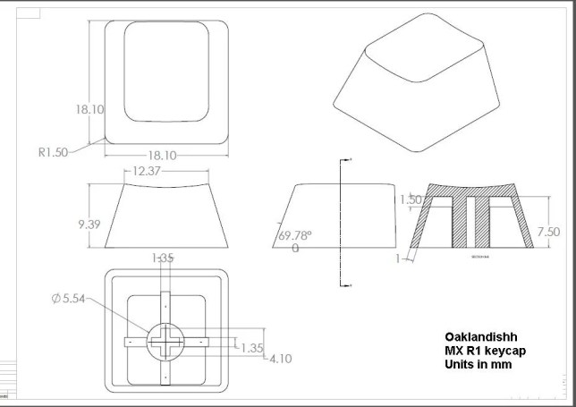 i found a drawing for the r1 cherry profile keycaps, and with some help from tim, created the first keycap.