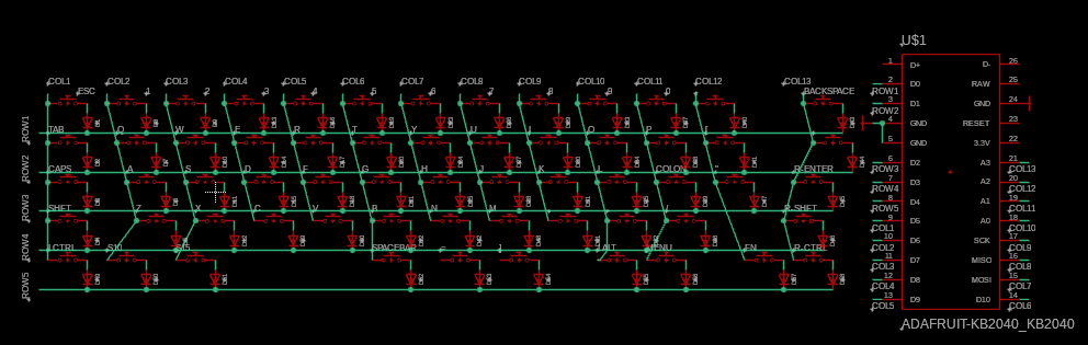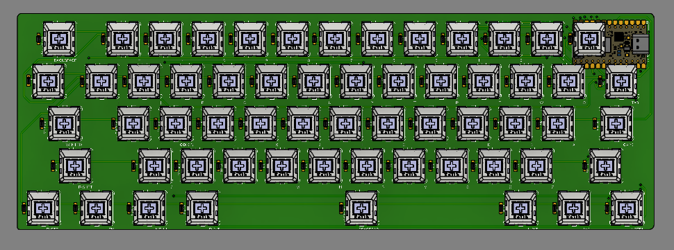 same thing as the macropad schematic, this time having more keys due to me making a 60% keyboard rather than a 2x4 macropad. i actually ran out of pins to use on the kb2040, so i had to create a 5x13 matrix rather than the standard 5x14 matrix