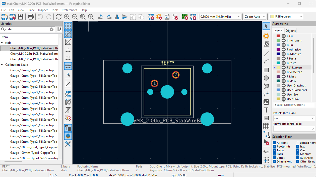 so i never really accounted for stabilizers for bigger keys, and i couldn't find any footprints for the switch + stabilizer besides kicad ones