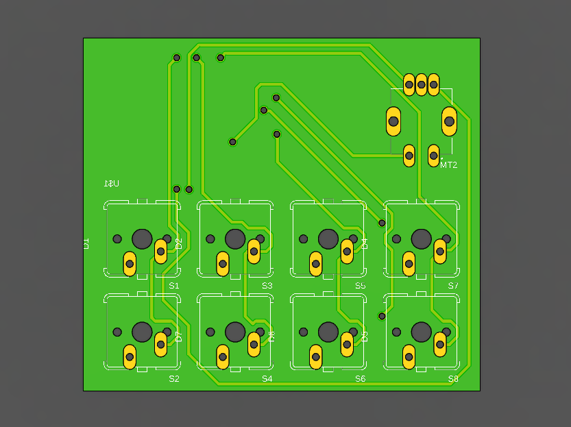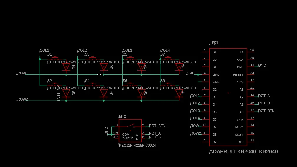 the pcb will utilize a 2x4 matrix to allow for a total of 6 pins to be used on the kb2040 rather than 8 total pins. while this isn't a huge improvement, it's good practice for when i need to scale up when making the actual keyboard.