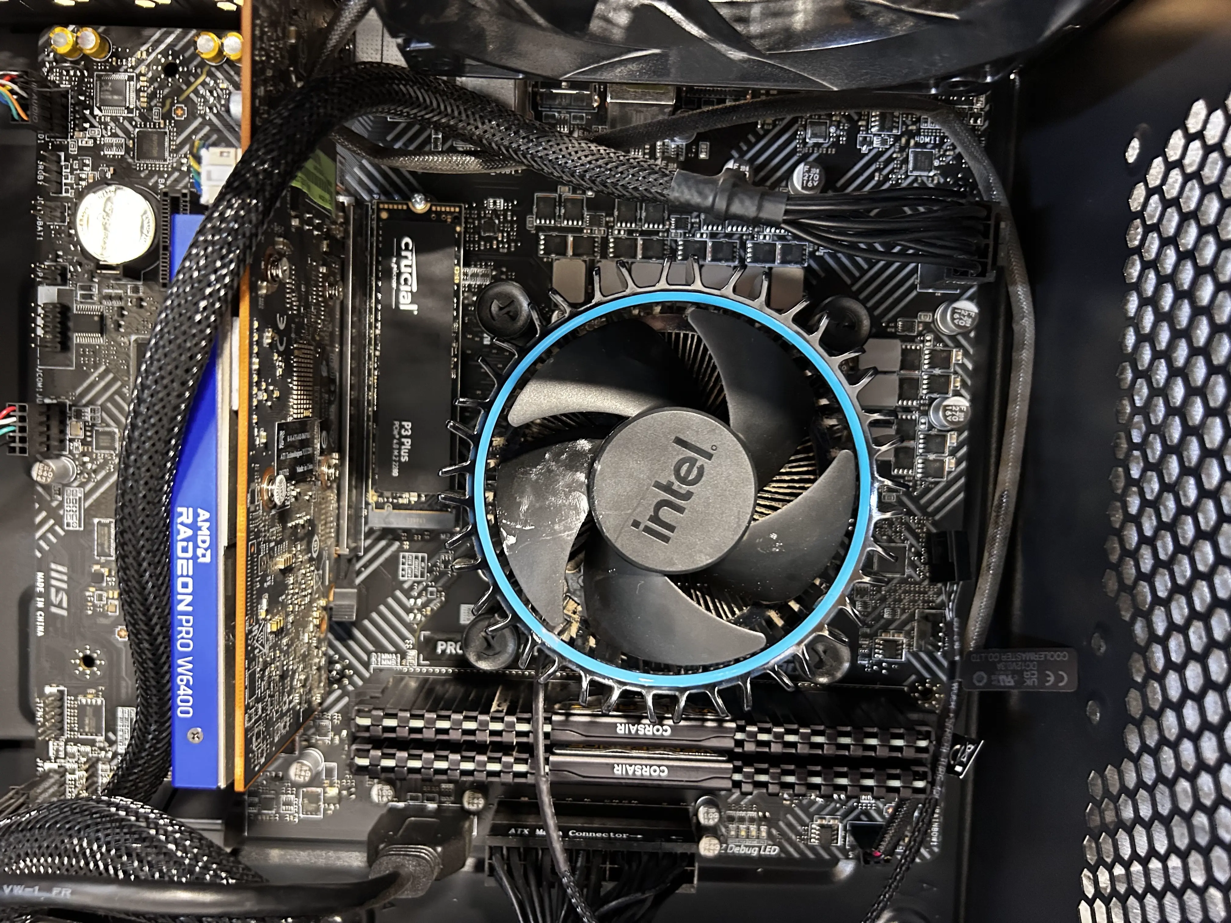 as a result, we assumed that the cpu wasn’t getting proper cooling, so me and miles decided to open up the computer and looked for the problem. instantly, we noticed that the cpu cooler wasn’t making direct contact with the cpu, but just in case, we also decided to repaste the cpu.