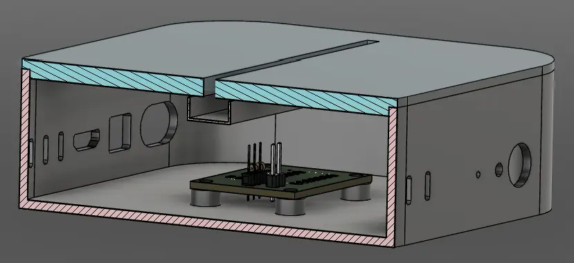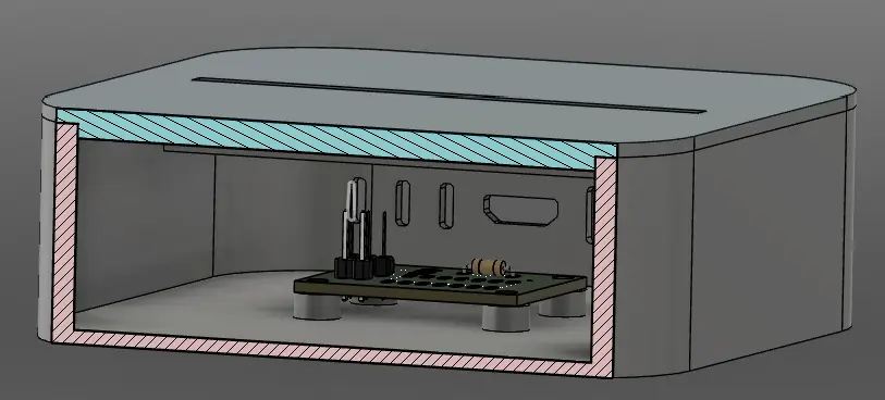 while finishing the box, a problem occured when making the lid, as the male headers on my pcb were too long and entering in the housing for the neopixel. to counteract this, i decided to scale my design by 0.75 instead of 0.5, leading to a slightly larger box.